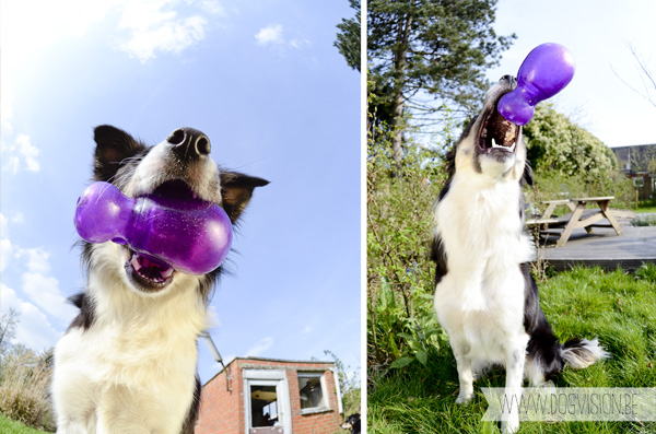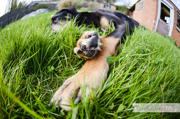 Het zonnetje schijnt warm op hun pelsjes, de verse sprietjes gras nodigen uit tot rollebollen en overal in de tuin valt er wel iets te snuffelen (geen idee wat, dat moet je de doggies vragen)