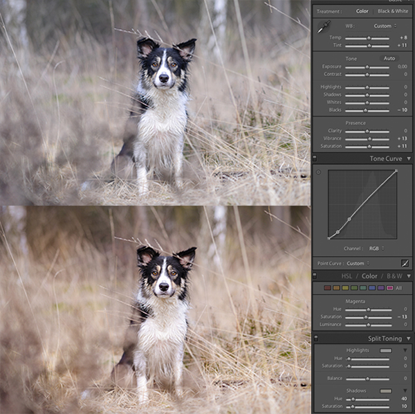 Nabewerking is afhankelijk van smaak – ofwel mensengoesting zoals ze hier wel eens zeggen. Het kan dus best zijn dat jij het helemaal anders zou aanpakken, en dat is prima. Er is geen Absolute Waarheid, en al helemaal niet op gebied van fotografie en nabewerking. Meestal doe ik niet zo veel nabewerking, vooral omdat de fotomomenten heel bewust gekozen worden op basis van het licht. Ik hou heel erg van zonnige momenten die de vacht van de honden doet blinken, de ogen doet glanzen en de natuur lijkt te overspoelen met kleur. En die momenten hebben naar mijn smaak niet teveel gepruts nodig. Soms is natuurlijk net perfect đ